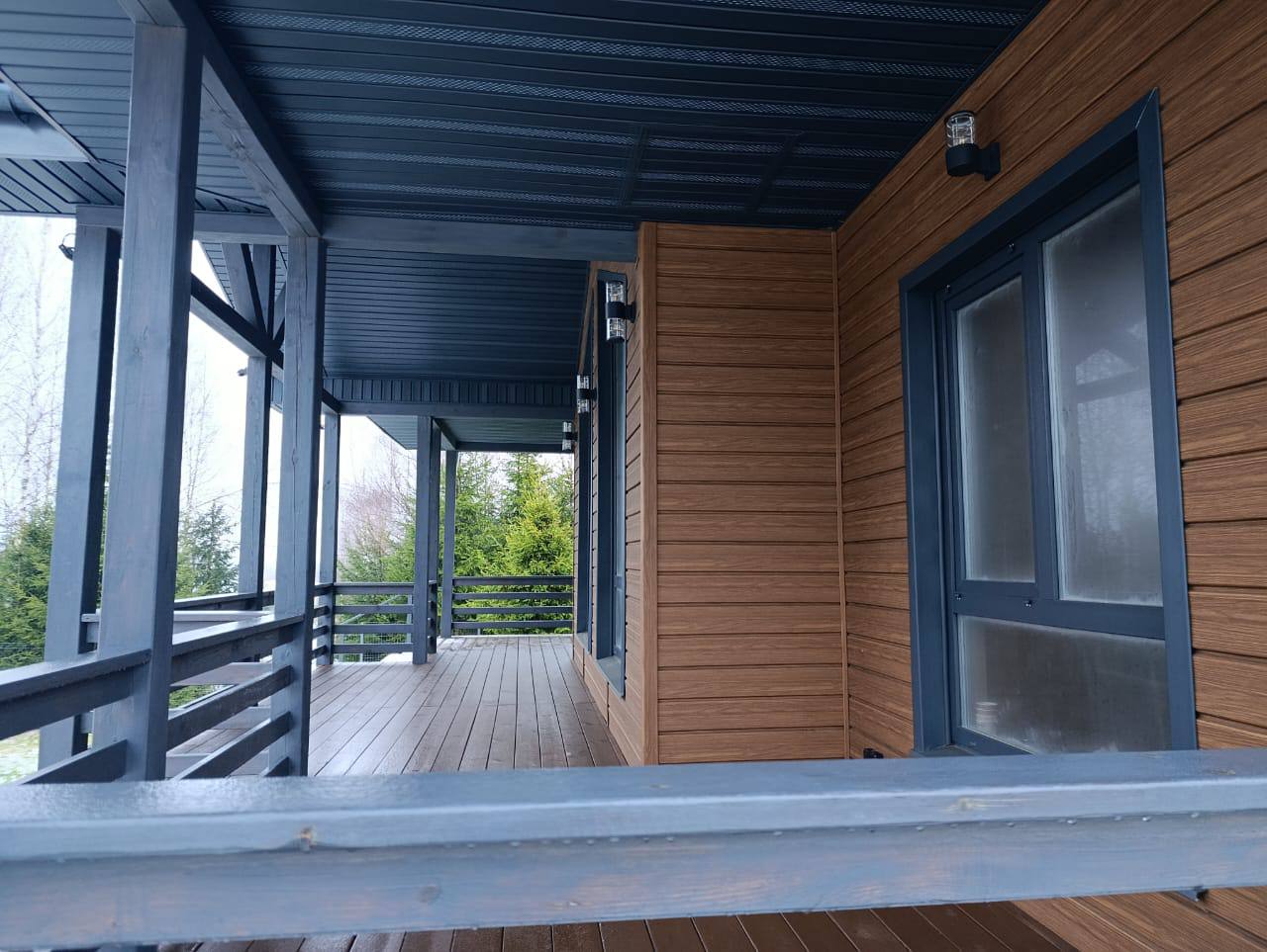 Пространство между стойками заполняется теплоизоляционным материалом (минеральная вата, эковата, пенополистирол и др.), который обеспечивает высокие показатели энергоэффективности. Снаружи каркас закрывается плитными материалами (OSB, ЦСП, фанера) и ветрозащитными мембранами, а внутри — пароизоляцией и облицовкой (гипсокартон, вагонка, СМЛ). Наружная отделка выполняется в зависимости от архитектурного решения: сайдинг, фасадные панели, штукатурка по утеплителю, деревянная обшивка и т.д.