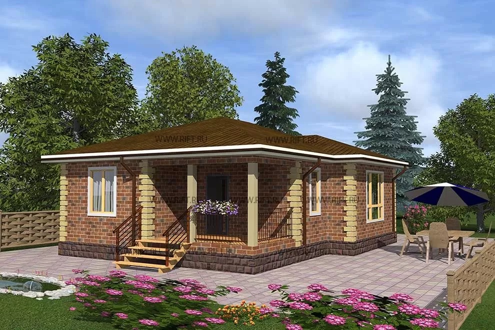 Другой интересный проект – это одноэтажный дом с гаражом. В нем предусмотрена просторная гостиная, кухня, три спальни, ванная комната и отдельный гараж на одну машину.