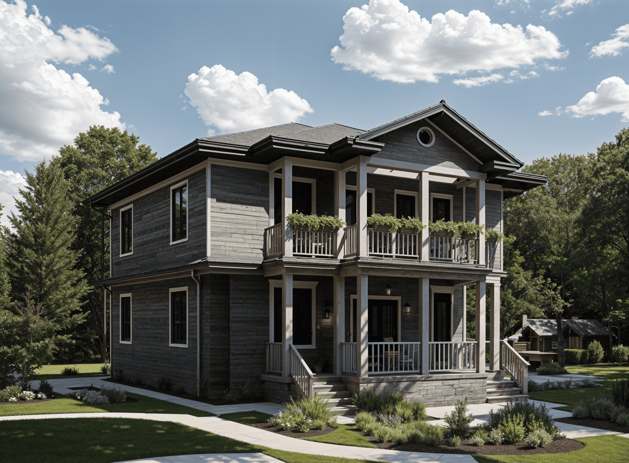 Современные технологии строительства позволяют сочетать разные материалы, добиваясь долговечности, эстетики и энергоэффективности. Это может быть газобетон, клеёный брус, каркасная технология, комбинированные стены или монолит. Внешняя отделка также разнообразна: фасадные панели, керамогранит, природный камень, дерево, штукатурка, фиброцементные плиты. Такое разнообразие позволяет создавать дома, которые не только красиво выглядят, но и долго служат без сложного ухода.